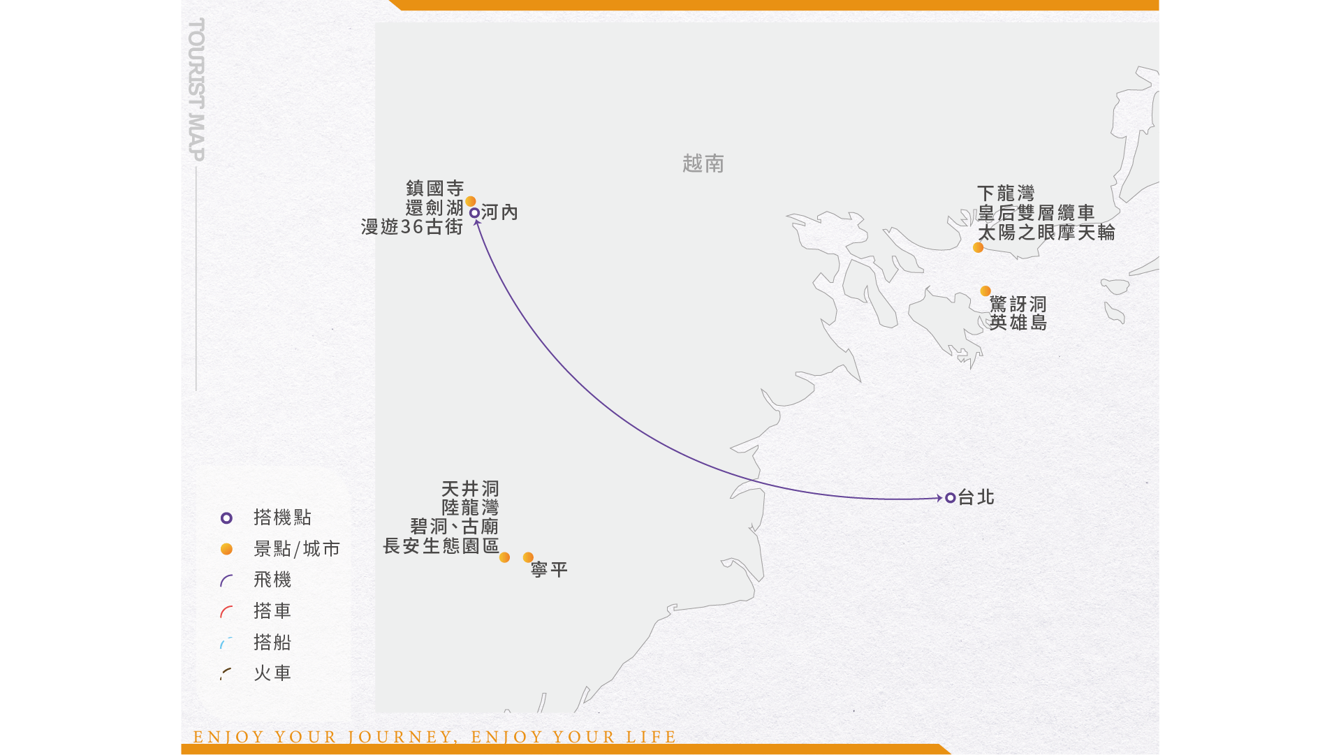 帶著愉快的心情集合於桃園國際機場,由專人辦理登機手續,搭乘豪華噴射客機飛往中南半島東側的越南,面積達331,689平方公里,全國人口約8,700萬;河內是座久遠的古都、越南傳統文化的搖籃。傳說中的「Gaz69」,是越戰時期的軍用吉普車,鋼鐵車身上還有五星標誌,彷彿時光倒轉回越南戰後的年代。