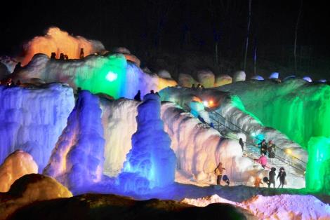 以山谷、溫泉著稱的層雲峽,到了冬季便搖身變為夢幻冰雪慶典《層雲峽冰瀑祭》,已經有超過50年的歷史,是北海道冬季人氣最高的冰雪祭典。位於石狩川河床的瀑布會場在嚴寒的氣溫下結凍成冰,加上各式冰雕,入夜後打上的五彩燈光與花火,點亮燦爛冬夜!